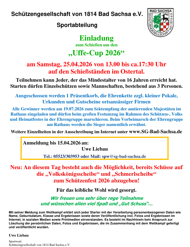 Die Schützengesellschaft lädt zum Schießen auf den "Uffe-Cup" ein. Am Samstag, den 25. April 2026 ab 13.00 Uhr kann jeder, der das Mindestalter von 16 Jahren erreicht hat, teilnehmen.